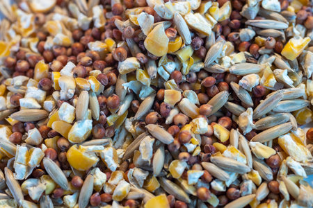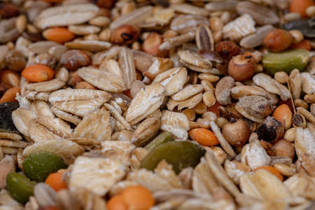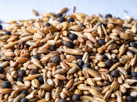 Closeup of a feed for Budgerigar. Closeup of grain, bird feed.