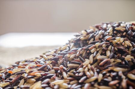 Food background with of rice variety . rice mixture. brown rice, black rice, white rice.