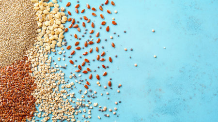 This image showcases a variety of grains and seeds artfully arranged on a blue surface, highlighting their natural textures and colors, ideal for promoting healthy eating and nutrition.
