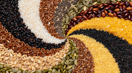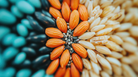 This vibrant image features an arrangement of assorted seeds and grains in various colors, showcasing their natural beauty and nutritional value. Perfect for food and health-related themes.