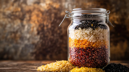 A clear glass jar filled with colorful rice varieties, set against a rustic background.