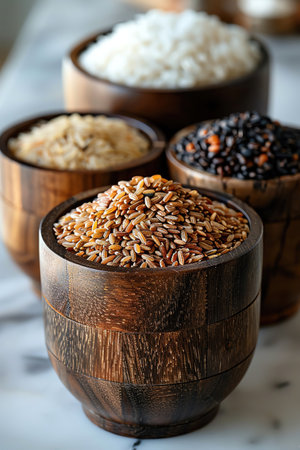 Four wooden bowls filled with different rice varieties, arranged on a white background