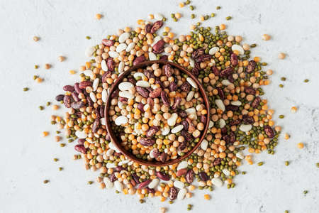 a wooden bowl with assorted mixed legumes scatter top view flat lay on marble background