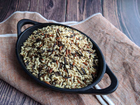 Overhead view of a mini pot of cast iron with Wild Rice with copy space.