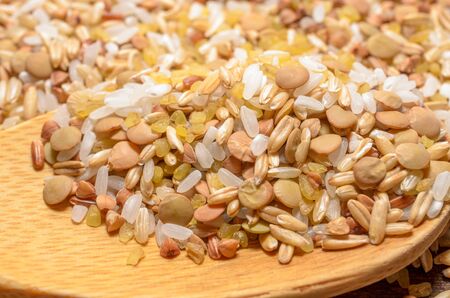 Assortment of various kinds grains in wooden spoon, healthy diet.