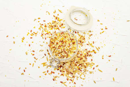 Mix of variety of cereals in glass jar. Assorted of indispensable ingredients for a healthy diet. White putty background, top view