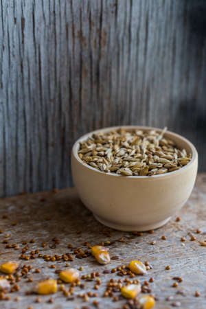 shot from a close distance of a mixture of cereals for growing gass for cats