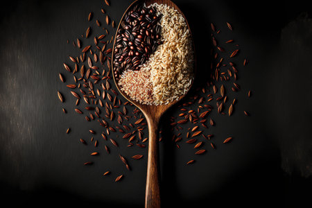 Brown or coarse rice, rice seeds, and a wooden spoon or fork. looking up