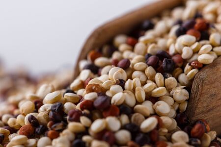 Mixed dry organic cereal and grain seeds in wooden spoon, for clean or healthy food ingredient or agricultural product concept