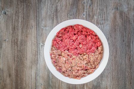 Minced meat from pork and beef in white bowl on wooden table, with copy space