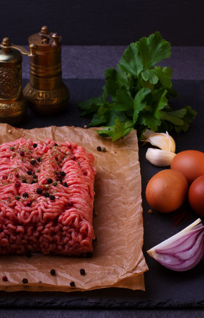 raw minced meat and spices on dark background., top view.