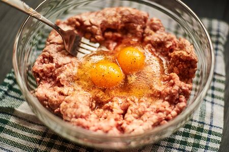 Minced meat with raw egg in a plate. Cooking meat products.