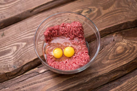 Fresh minced meat with chicken eggs on a plate on a wooden background for cooking.