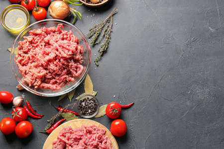 Raw ground beef or pork with salt, spices, herbs and tomatoes on a dark concrete background