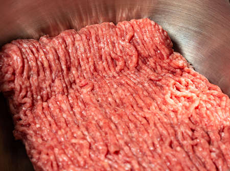 Minced beef close-up in a metal plate. Minced cutlets cooking for dinner. beef, grinder, raw, food