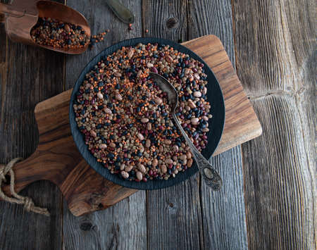 Colorful mixed legumes and cereals with wooden scoope on black background.