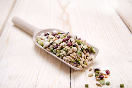 Wooden spoon and mixed raw legumes