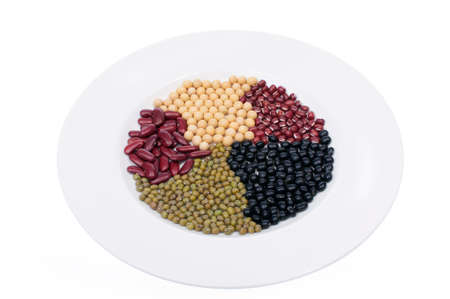 Organic mixed Beans; Green, Black, Red, White and Chick pea on plate