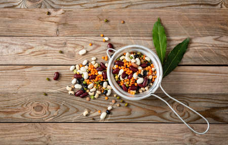 Healthy diet concept.Assortment of legumes in a stainless drainer and spilled on a wooden tabletop background, isolated, top view.