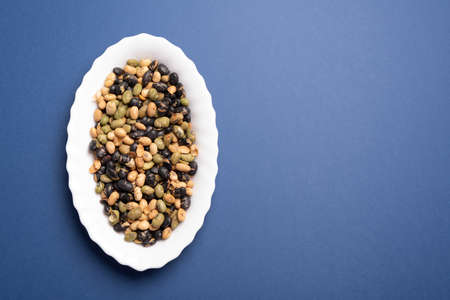 Snack mix of edamame and toasted soy on close-up over a marine dark blue desk as background