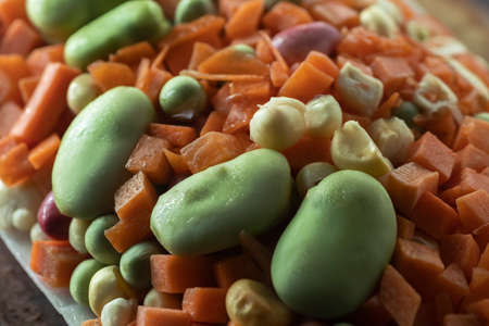 Tray of different peasant vegetables beans-carrot-peas-carrot-carrot-curly corn