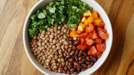A vibrant lentil salad featuring a mix of fresh chopped vegetables. Perfect for a healthy diet, this colorful dish showcases a variety of textures and flavors.