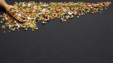 Header, colorful legumes mixture, lentils, beans and peas, healthy nutrition