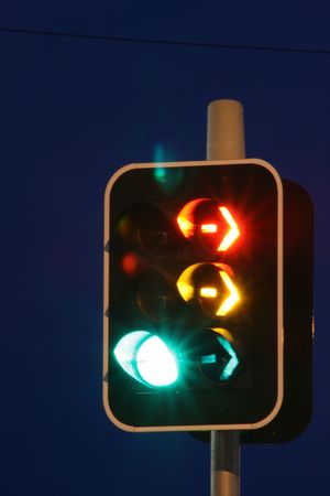 Traffic light with arrow red light and green light against the evening sky.