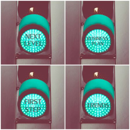Photo collage with concept messages written over green traffic lights