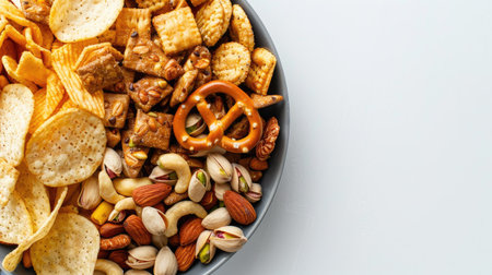 A bowl filled with assorted chips, pretzels, and cheesy snacks, perfect for a movie night or party.
