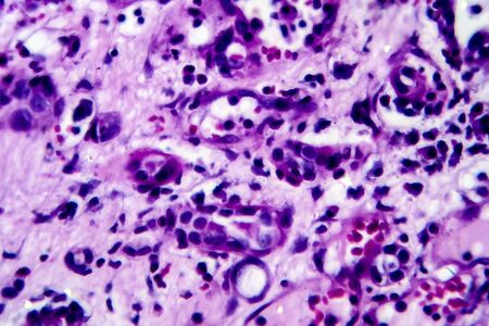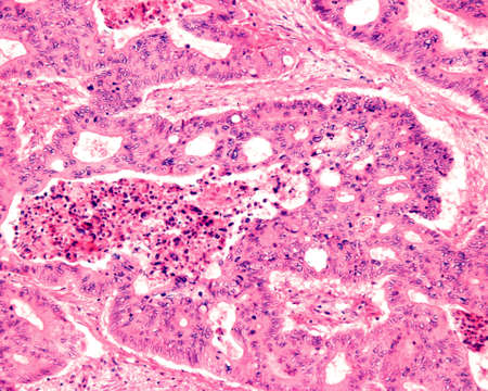 Ovarian cancer, light micrograph, photo under microscope. Photograph shows a fragment of a cancerous tumor in the female ovary. Selective focus