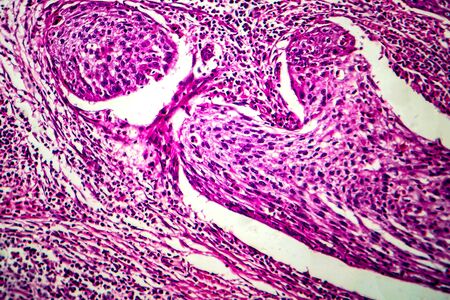 Squamous cell carcinoma diseased tissue under the microscope 100x