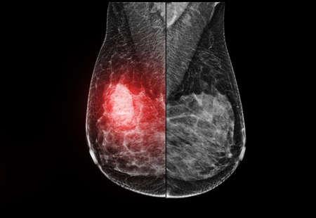 X-ray Digital Mammogram or mammography of the breast MLO view for diagnonsis Breast cancer in women isolated on black background.