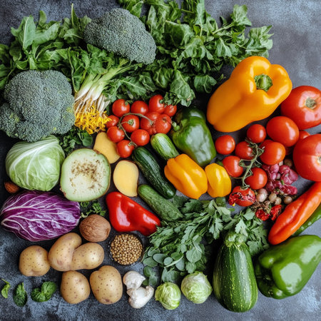 A diverse collection of fresh organic vegetables is beautifully arranged with various colors and types, showing the bounty of nature. This vibrant display features bell peppers, tomatoes, zucchini, and mushrooms, reflecting a healthy lifestyle and promoting the benefits of eating fresh produce.
