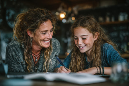 Woman and girl are happily collaborating on a writing task, demonstrating a nurturing educational experience in a warm, inviting space filled with creativity and connection