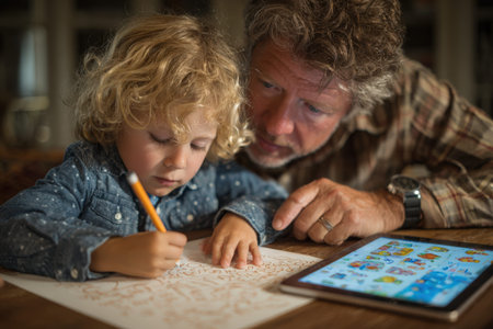 Child focused on drawing with pencil on paper, while older man provides guidance and encouragement, creating a warm and engaging atmosphere for learning