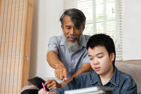 Interactive Learning Experience. A grandfather enthusiastically engages with his grandson during a study session.