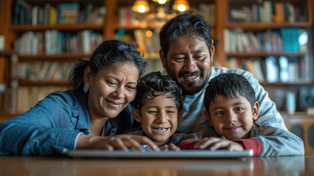 Latin parents and their two children are happily engaging in online entertainment on a laptop.