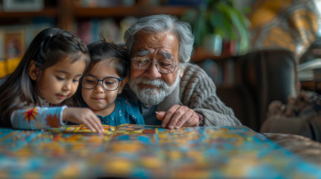 Focused elderly Indian grandfather shares a special moment with his two young granddaughters, teaching and reading together at home.