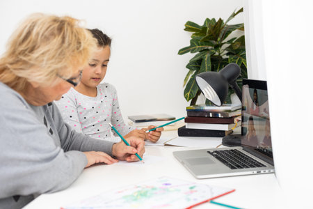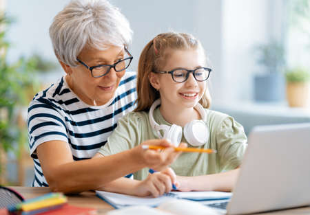 Small girl with senior grandmother doing homework at home.