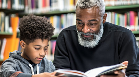 An older student guides a younger student in a library, fostering a supportive learning environment with shared knowledge and growth through reading and mentoring.