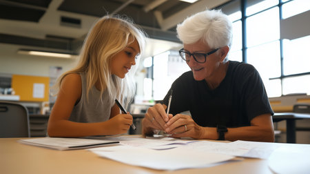 Elderly mentor helping a young girl with her schoolwork in a bright classroom setting
