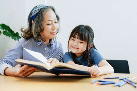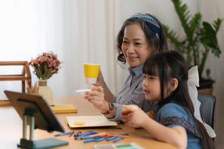 Asian portrait, grandchild granddaughter grandma grandmother and granddaughter happily join in activities to enhance skills for grandchildren.