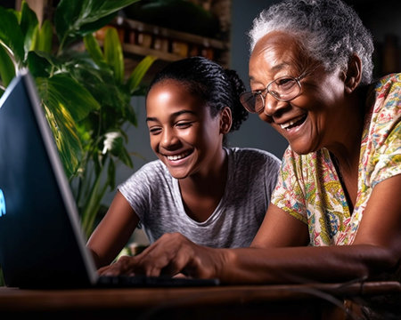 Generative AI : Senior woman with credit card and laptop smiling with happy young granddaughter while sitting at table and making online purchases together