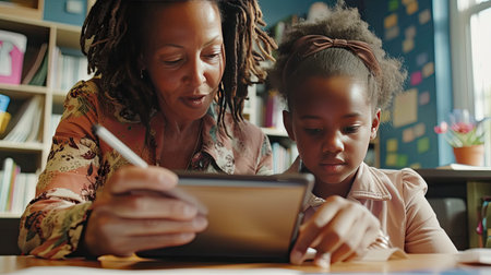 African american female teacher teaching caucasian girl to use digital tablet in the class at school. - AI Generated.