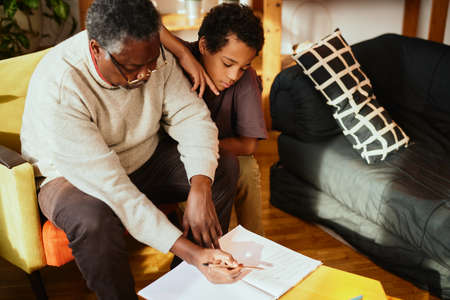 An African-American grandfather is sitting at home with his grandson and explaining a math problem to him.