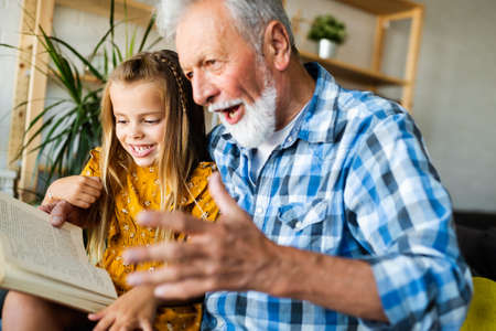 Happy little girl with grandfather reading story book at home