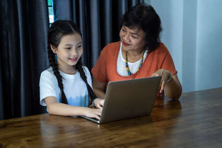Asian Grandmother with her two grandchildren having fun and playing education games online with a computer notebook at home in the living room. Concept of online education and caring from parents.