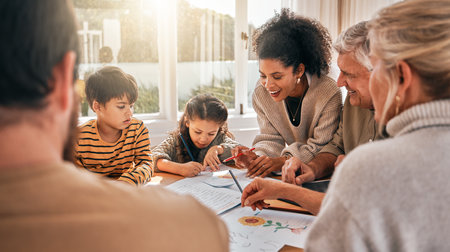 Family house, kids and education with grandparents, homework and parents with drawing at desk. Mother, father and children with writing, happy and notebook in busy home with help, reading and study