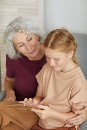 Granny and preschool girl using tablet together at home on the sofa, family togetherness time